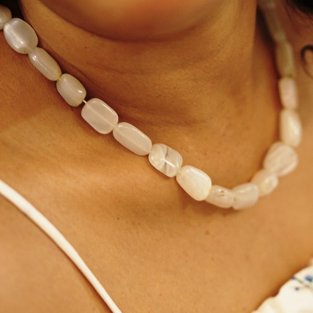 Moonstone Bead Necklace is a graceful crystal jewelry piece known for its soothing and nurturing energy. Crafted with naturally milky white moonstone beads, it supports emotional balance, inner peace, and heightened intuition. Moonstone is often associated with feminine energy, new beginnings, and gentle healing, making it ideal for daily wear or mindful practices. Its subtle sheen and minimal design make this necklace perfect for both casual outfits and spiritual styling.