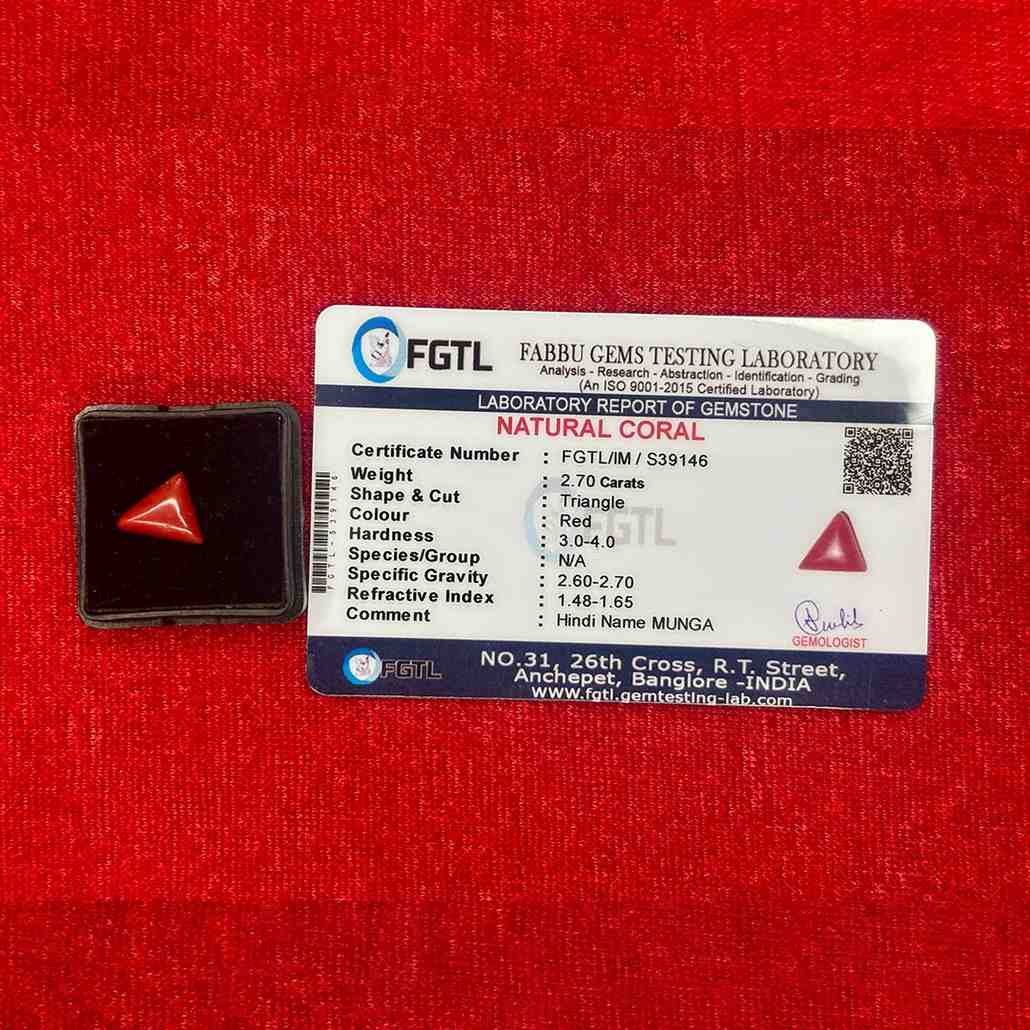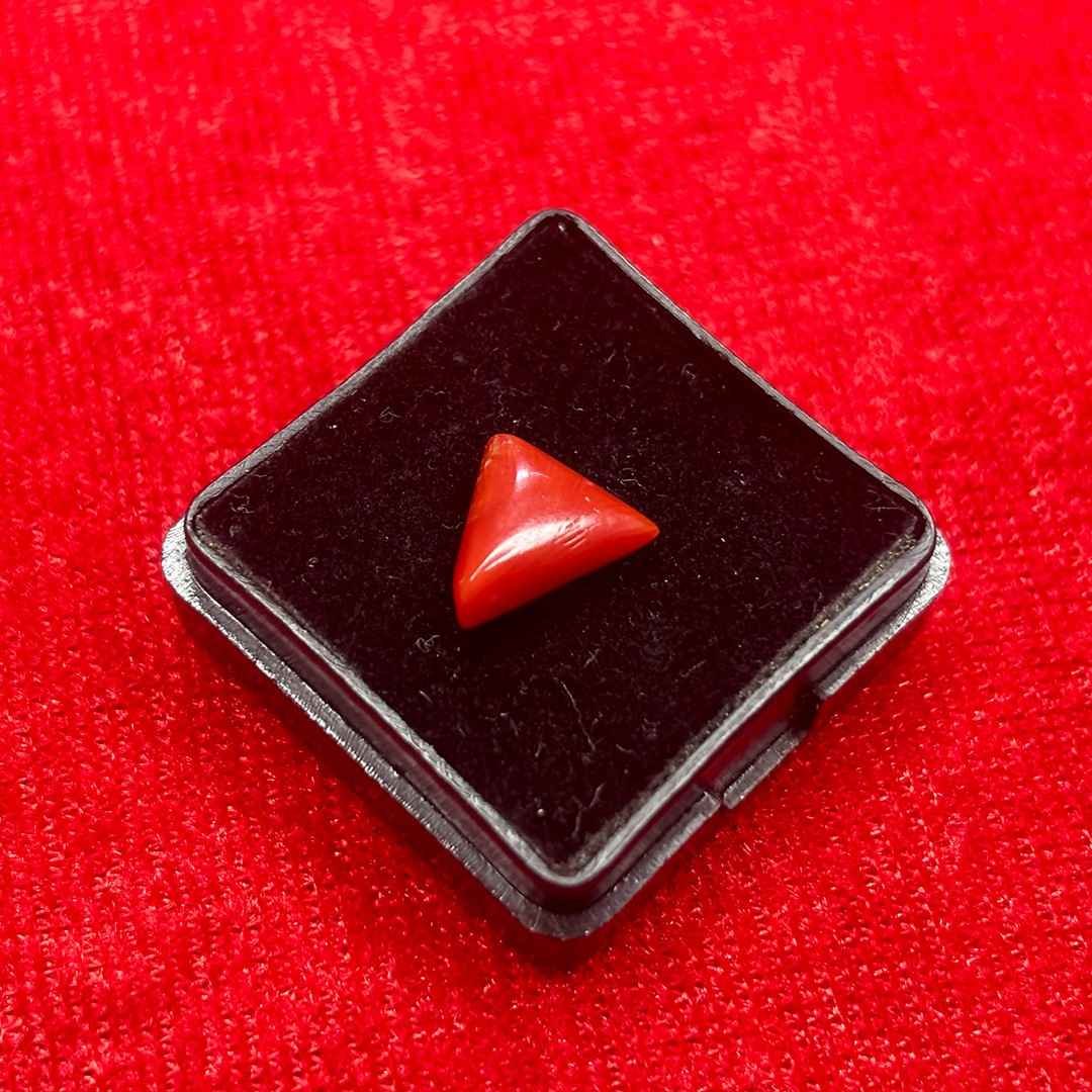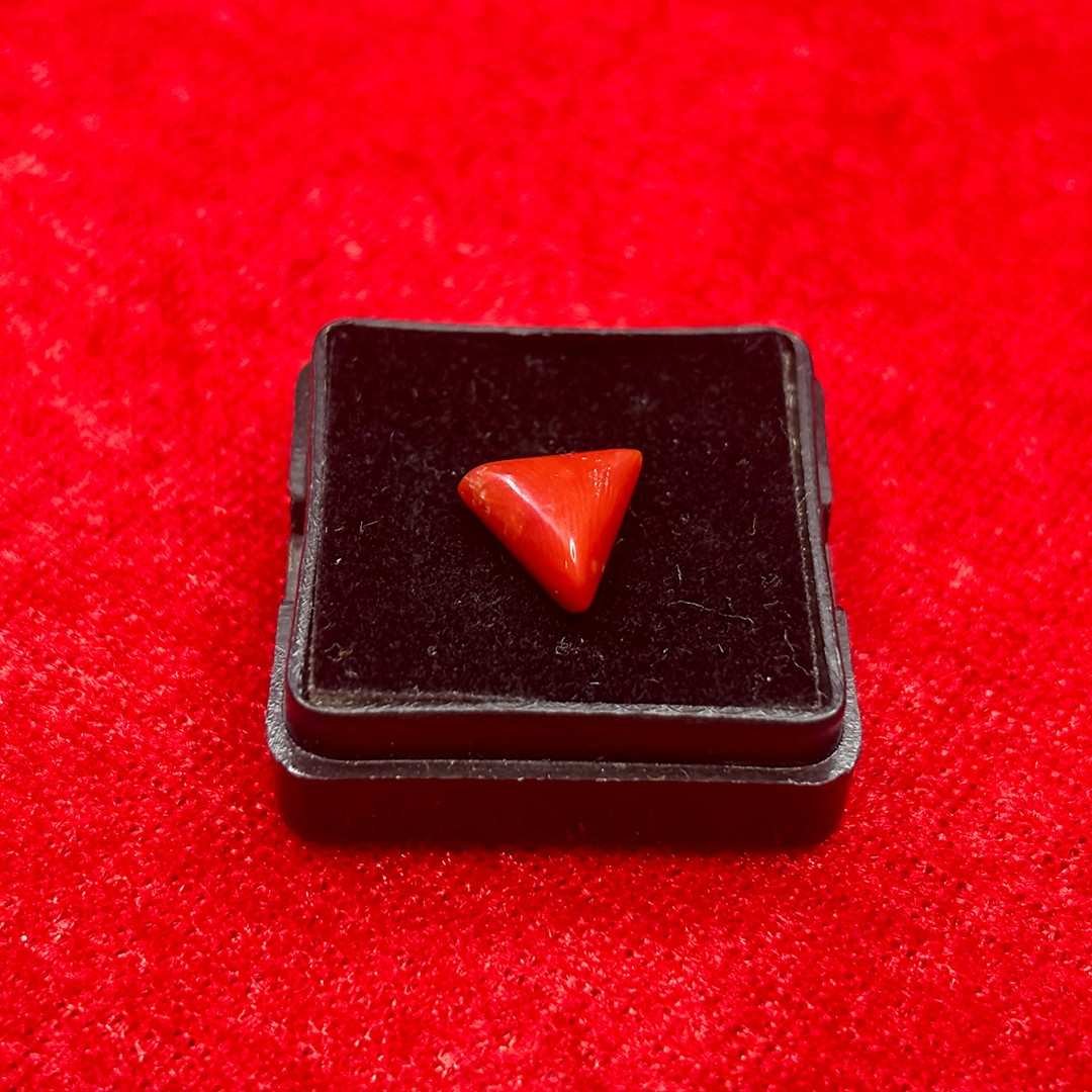 Natural red coral 2.70 carat triangle cut is an organic gemstone associated with strength, courage and action. Known as Moonga in Vedic traditions, it is connected to Mangal (Mars), the planet of energy, drive and execution.