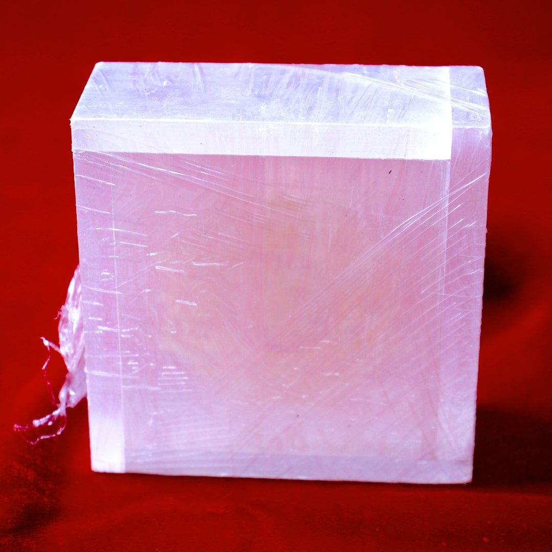 A large square Selenite Lustreveil bowl crafted for sacred purification and structured charging of crystals and ritual tools.