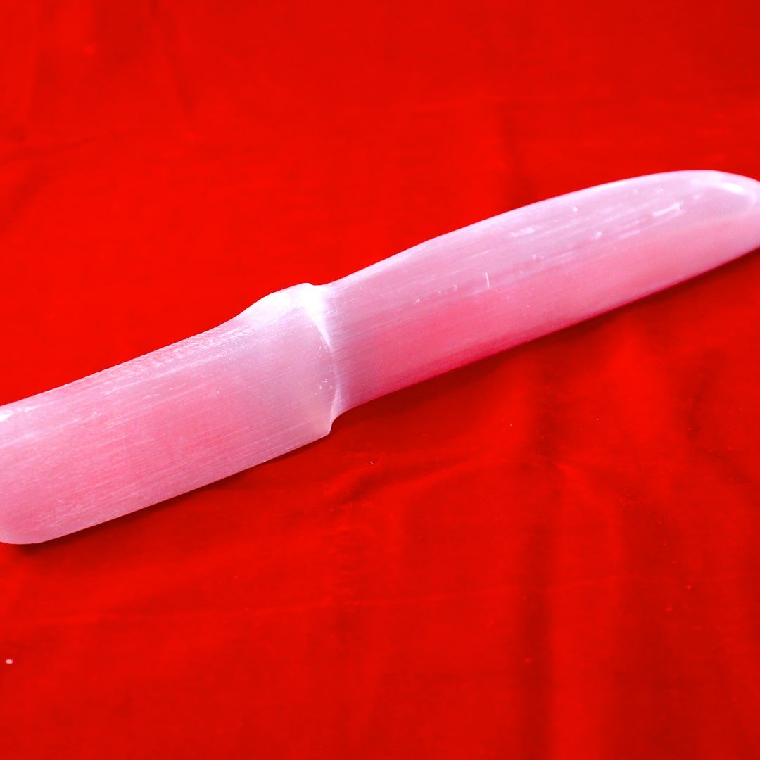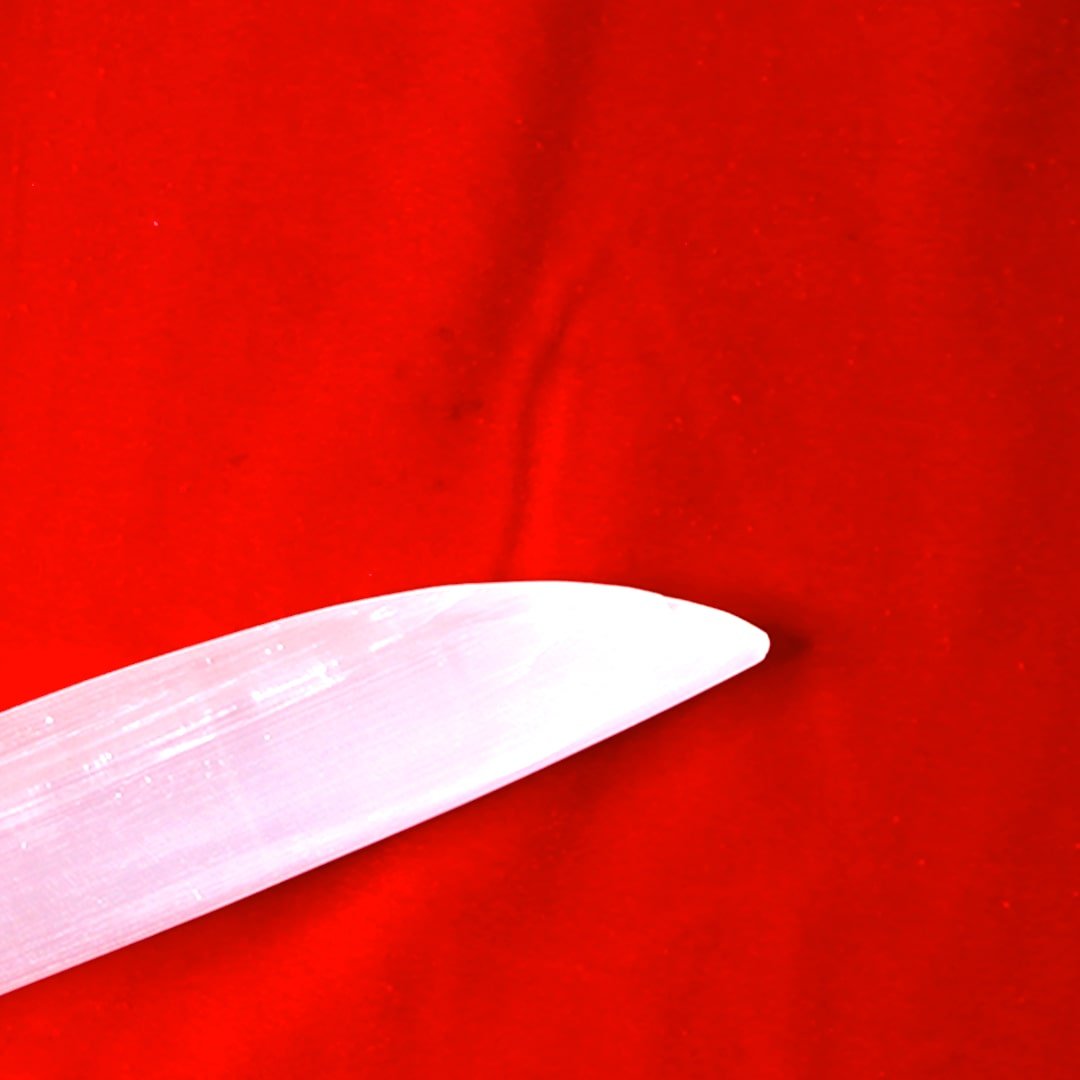 Designed for ritual cleansing, energy clearing, and symbolic cord-release practices. The Selenite Lustreveil – Ritual Cleansing Blade serves as a ceremonial tool for structured purification rituals. Selenite is traditionally regarded as a stone of illumination and energetic clarity, often used to cleanse stagnant or residual influences. This blade form is commonly used in symbolic cord-release practices, where it is gently passed through the surrounding aura or between spaces to represent the clearing of unwanted energetic ties. It is intended as a ritual instrument, not a physical cutting tool. WHAT THIS SUPPORTS: • Ritual cleansing and energetic reset • Symbolic cord-release practices • Clearing stagnant or lingering influences • Supporting focused purification ceremonies HOW TO USE: • Hold with intention during meditation or cleansing ritual • Move gently through surrounding space to symbolise release • Store respectfully in a clean and dedicated area
