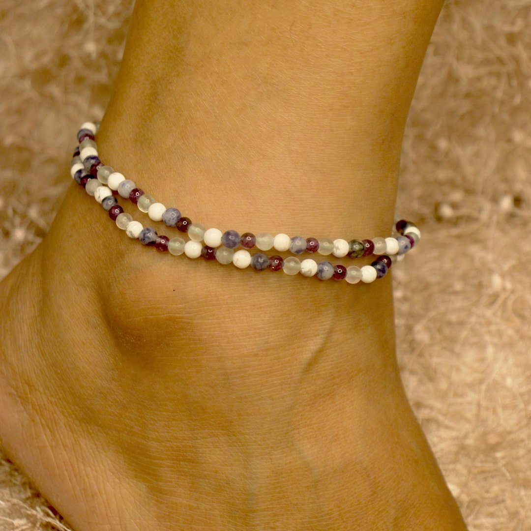 The Intellect Activator Anklet is a specialised AuraSteps anklet designed to support mental performance, creativity, and sustained concentration. Crafted with Fluorite, Howlite, Amethyst, and Lapis Lazuli, this combination helps improve focus, enhance memory retention, stimulate creative thinking, and reduce mental fatigue during study or intellectual work.