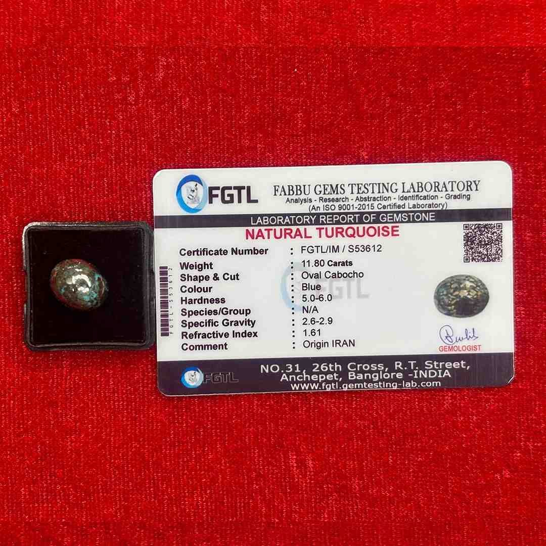 Certified Irani Firoza (Natural Turquoise) weighing 11.80 carats, oval cabochon cut, showcasing a rich blue tone with natural matrix and authentic Iranian origin.